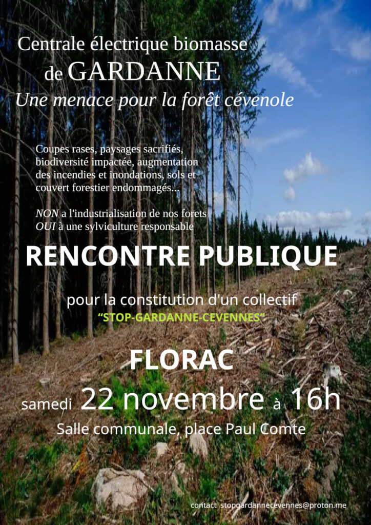 Une rencontre publique se tiendra autour de la relance de la centrale biomasse de Gardanne le samedi 22 novembre, 16h, à Florac, salle communale, place Paul Comte. Nous souhaitons créer un collectif pour préserver les forêts d’ici et d’ailleurs.