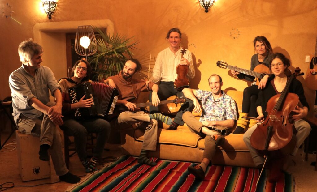 Tradosphère, c’est la rencontre entre les danses trad d’ici et les musiques du monde. Un cercle circassien bulgare, un andro équatorien, une mazurka malienne ou une valse réunionnaise… il y en a pour toutes les sensibilités, et le voyage se fait autant par le corps que par les oreilles, pour un concert – Bal trad ancré et voyageur. Tradosphère, ce sont aussi sept musicien.nes passionné.e.s, au violon, violoncelle, clarinette, accordéon, guitare, charango, basse, percussions du monde… Les voix, solistes et polyphoniques, renforcent encore l’émotion et l’énergie.